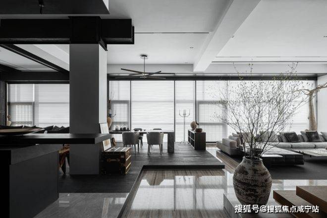 空间是光影的容器,自然光穿透白色的纱帘给会客厅加了一层摩登的滤镜。两侧纱帘光影通透,暗香浮动,几丝波影乍如烟。一处吧台,临烟火,酌清欢。烟火清欢,一半一半。