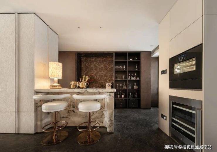 厨房内竹纹夹丝玻璃门、威乃达坡璃烤漆橱柜、与卡拉拉金大岩板台面相融,同时嘉格纳十件套满足每一种味蕾的偏好,厨房内,灶台/油烟机/洗机/冰箱(独立分体设计)五件套;向外,嘉格纳咖啡机/暖碟机/酒柜/烤箱/蒸箱等西厨五件套配置,构筑中西共融的烹饪场域。
