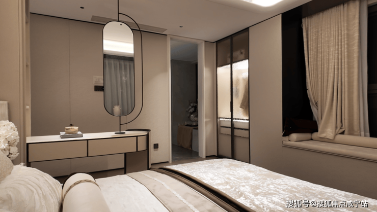 这里主卧,转角飘窗,对主卧空间的延展效果还是很好的。不计算飘窗的话净面宽应该在3.6m、进深4.7m左右。单单居住的这部分空间就将近16-17㎡。