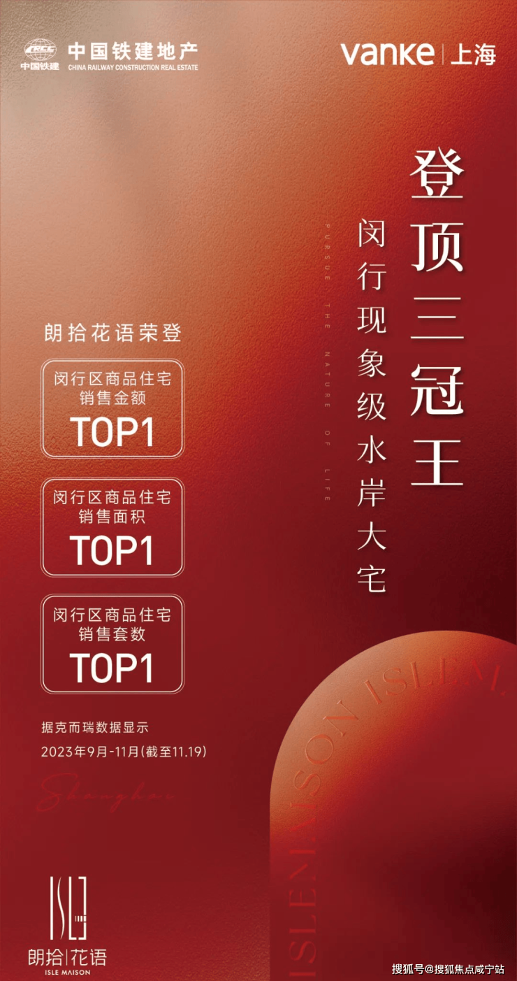 澎湃的流量折射的是朗拾花语的城市影响力,在如潮的关注度下,朗拾花语的销售自然,据克而瑞最新数据显示:在刚过去的9-11月(截止至11月18日),朗拾花语一举拿下「闵行区商品住宅销售金额TOP1」、「闵行区商品住宅销售面积TOP1」、「闵行区商品住宅销售套数TOP1」,以名副其实的【三冠王】汇聚整个区域的目光。