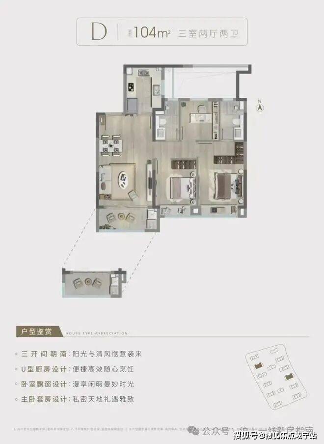 建面约104㎡3房2厅2卫,中间套D户型,做到了三开间朝南+主卧套房设计+朝南卧室带飘窗+动静分离,采光和通风俱佳。