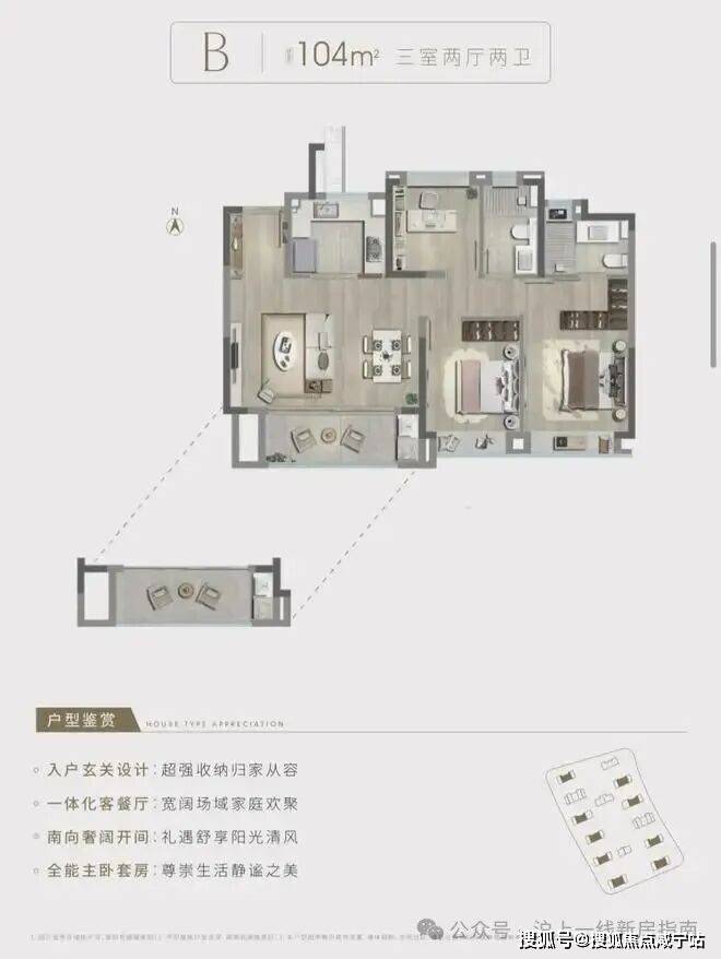 建面约104㎡3房2厅2卫,中间套B户型,做到了四开间朝南+全卧室带飘窗+主卧套房设计,采光面拉到极致。
