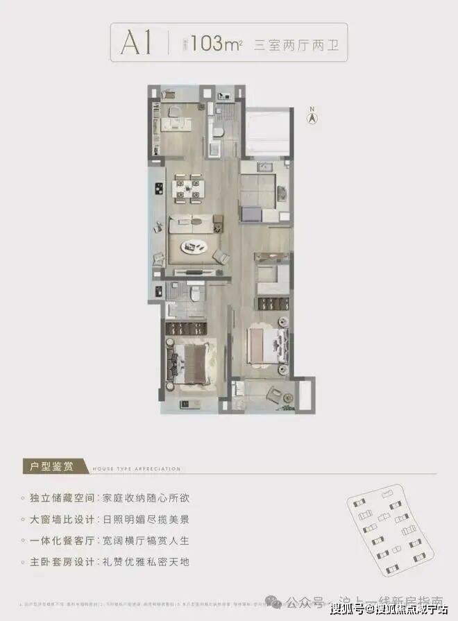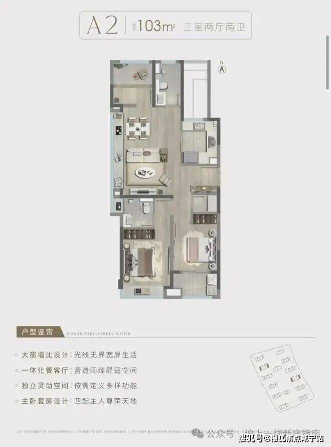 建面约103㎡3房2厅2卫,边套户型,做到了三个面采光+双开间朝南+主卧套房设计+南北通透,室内通透明亮。