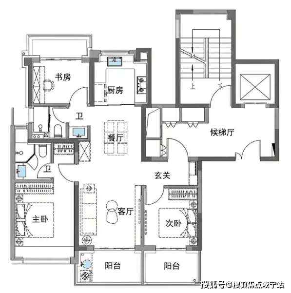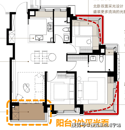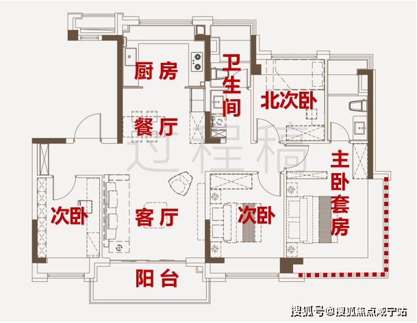 另一种是四开间朝南,例如下图。这种设计在功能性非常强,几乎可以满足从刚需到刚改的两部分需求。