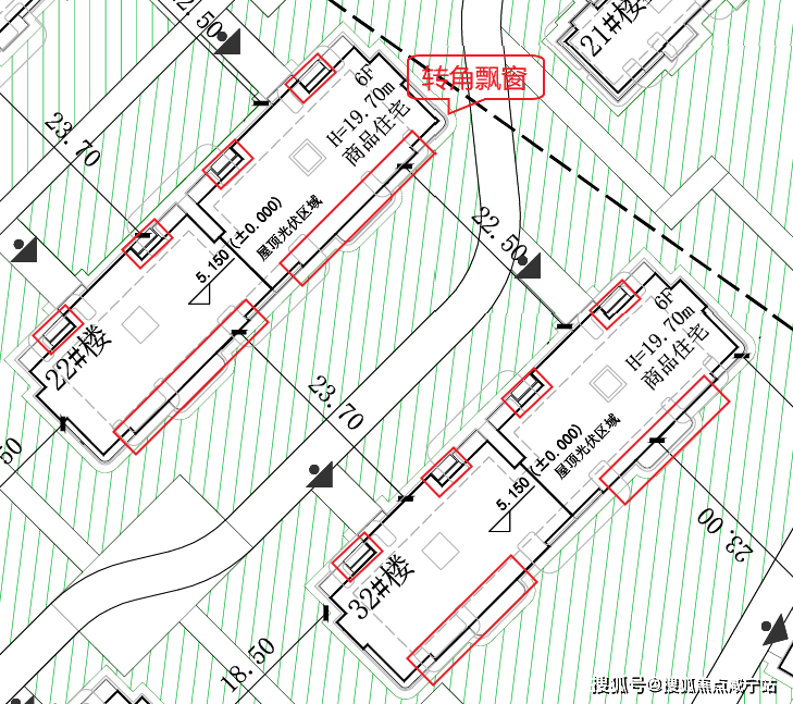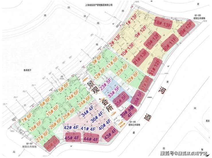 在设计上,楼栋采用约35-60度的斜向楼栋排布,最大化利用沿河景观资源,超10栋楼(红色标记楼栋)的住户可以直接享受优质河景视野。