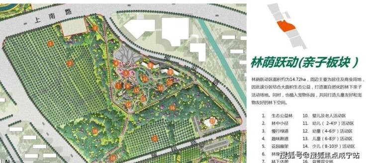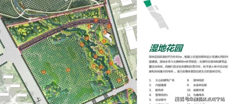 整座公园(在建中)划分为:湿地花园区、鸣湖共享区、林荫跃动区和社邻园艺区,四大功能分区。