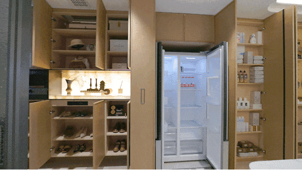 此外,还预留了冰箱位置,冰箱旁约60cm的高深拉篮柜体,能够轻松放置各类零食、小件用品,让囤货与美学互不打扰。