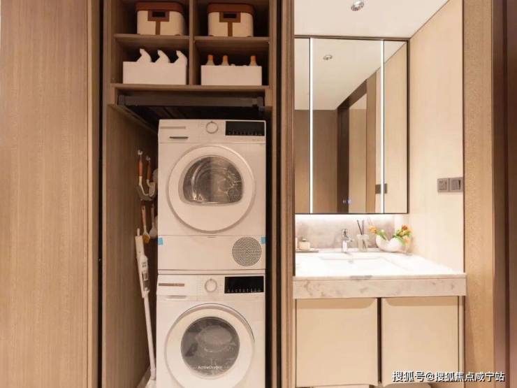 客卫前整面柜体打造独立家政间,直接配置博世洗烘套装。即便是市中心的塔尖豪宅,也很少见交付洗烘套装的,更不要说还是博世系列品牌,确实很惊喜了。