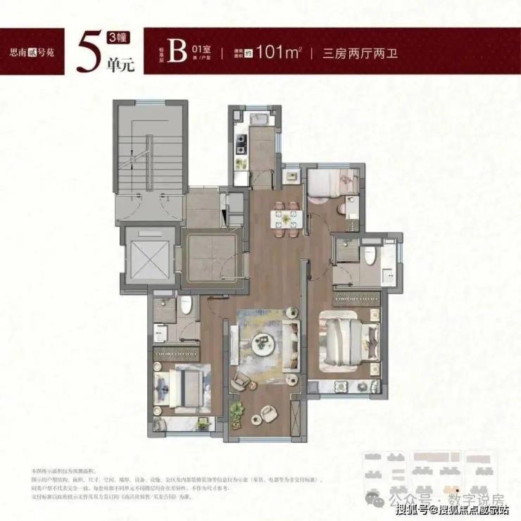 建面约100-101㎡户型, 拥类独立电梯厅,无连廊+飞机户型南北通透。