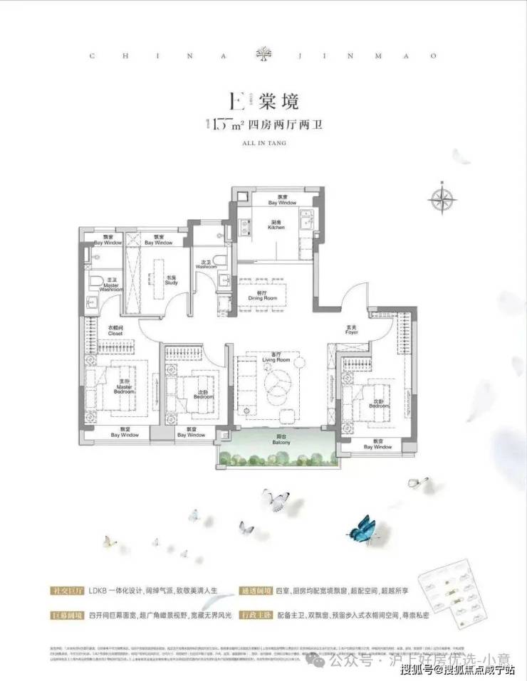 建面约117㎡3房2厅2卫,做到了 3+1开间朝南+5个飘窗+主卧套房设计+270°转角飘窗,所有的尺度都有进一步提升。