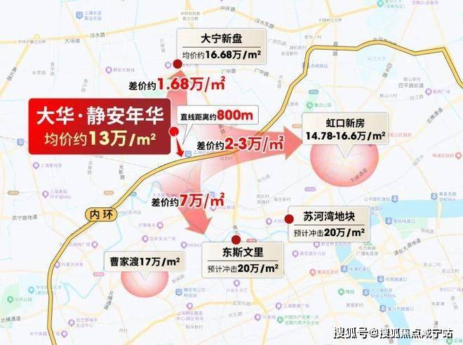 放眼整个静安区,曹家渡17万/㎡,东斯文里和苏河湾项目预计冲击20万/㎡,和大华·静安年华高层差价预计近7万/㎡。