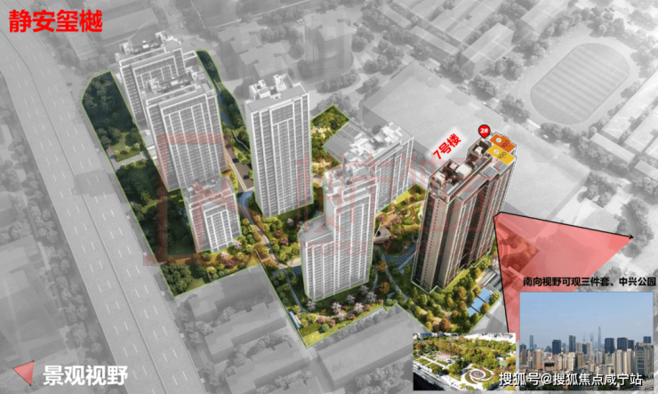 7号楼,位于整个小区的南面头排位置,前排无遮挡,拥有王炸级的城市景观资源: