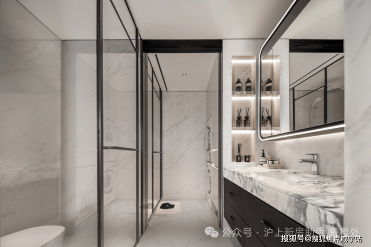 ✔卫生间地面和墙面整体性也非常强,奢石台面的纹路和岩板墙面和协调。