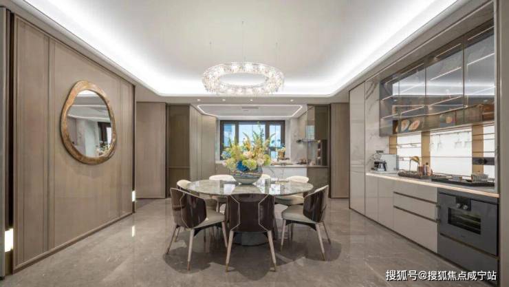可以容纳10-12人的大餐厅还配置了超大餐边柜,深度大到可以放得下一个独立冰箱或红酒柜,还配备了滨特尔净⽔器+弗兰卡⻰头⽔槽+滑轨插座,可以作为西厨或咖啡吧酒吧台使用,匠心十足!