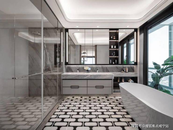 值得一提的是,主卧洗⼿间采⽤⾼规格五件套(双台盆、⻢桶、淋浴、浴缸),墙⾯采⽤爱尔兰绿岩板,地⾯辅以艺术感的⿊⾊墨⽟和雅⼠⽩⽟天然⼤理⽯⽔⼑拼花铺装,处处彰显空间的⾼级质感~
