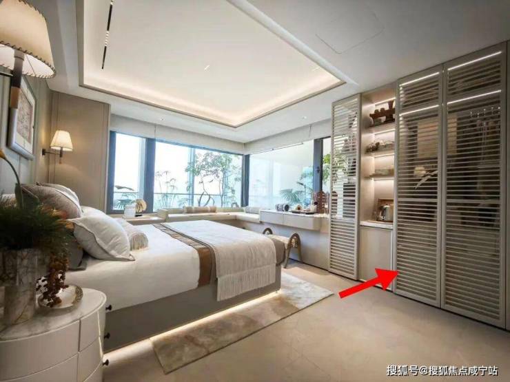 在此基础上,本案在建面约120㎡户型的主卧内,先利用飘窗做了270°采光,最大程度获得更好的视野、通风;其次是利用飘窗做了一整面的收纳柜子,收纳空间被大大释放!