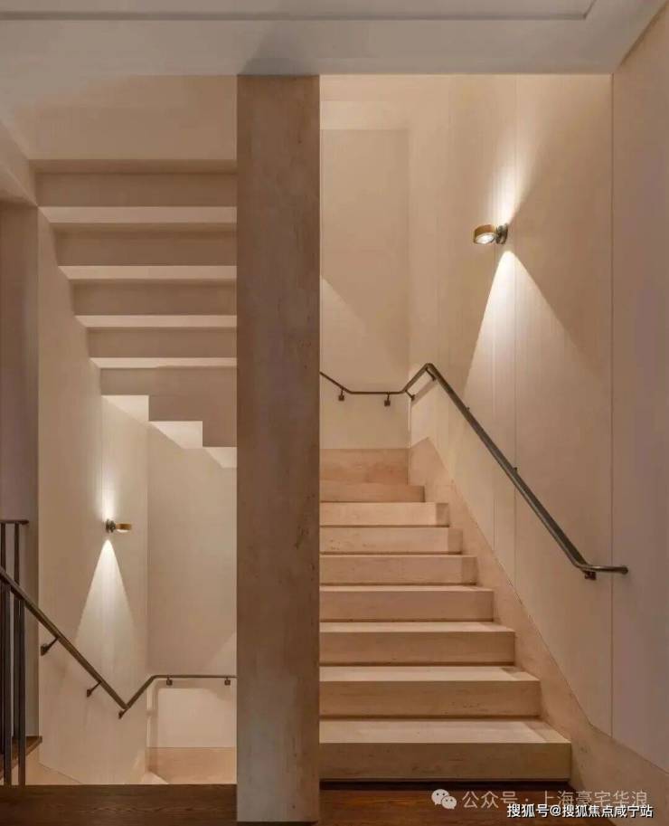 深铜色的栏杆和扶手融合传统与现代语汇,演变出一种当代型态,与现代白色洞石相映成趣,营造出优雅纯粹的意境。
