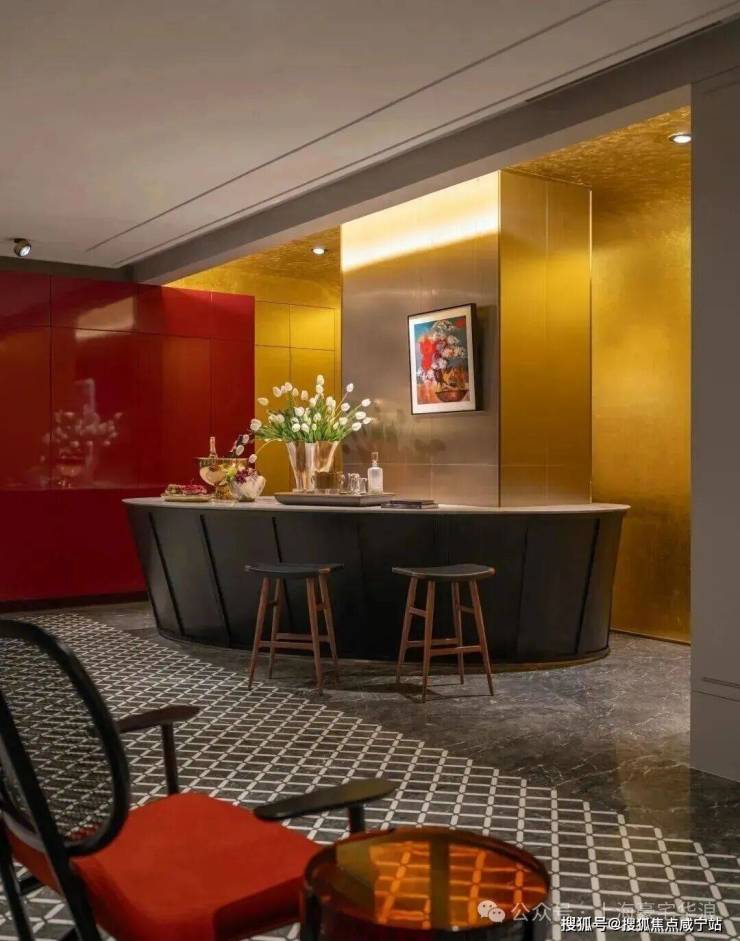 在“木屋”后方,是一个墙面和天花板都覆盖金箔的“水吧”。在这里,我们重新引入了一些当代西方设计语言——大理石地面图案、蛋形吧台和墙面护板细节。这些元素与醒目的红色高光烤漆柜相互平衡。