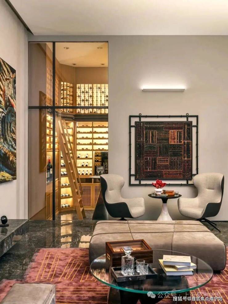 在对角,我们开辟了一面落地窗展示酒窖,展现主人的收藏。温暖的酒窖灯光和壁炉光线映照在白橡木酒架上,为客厅带来温暖舒适的氛围。