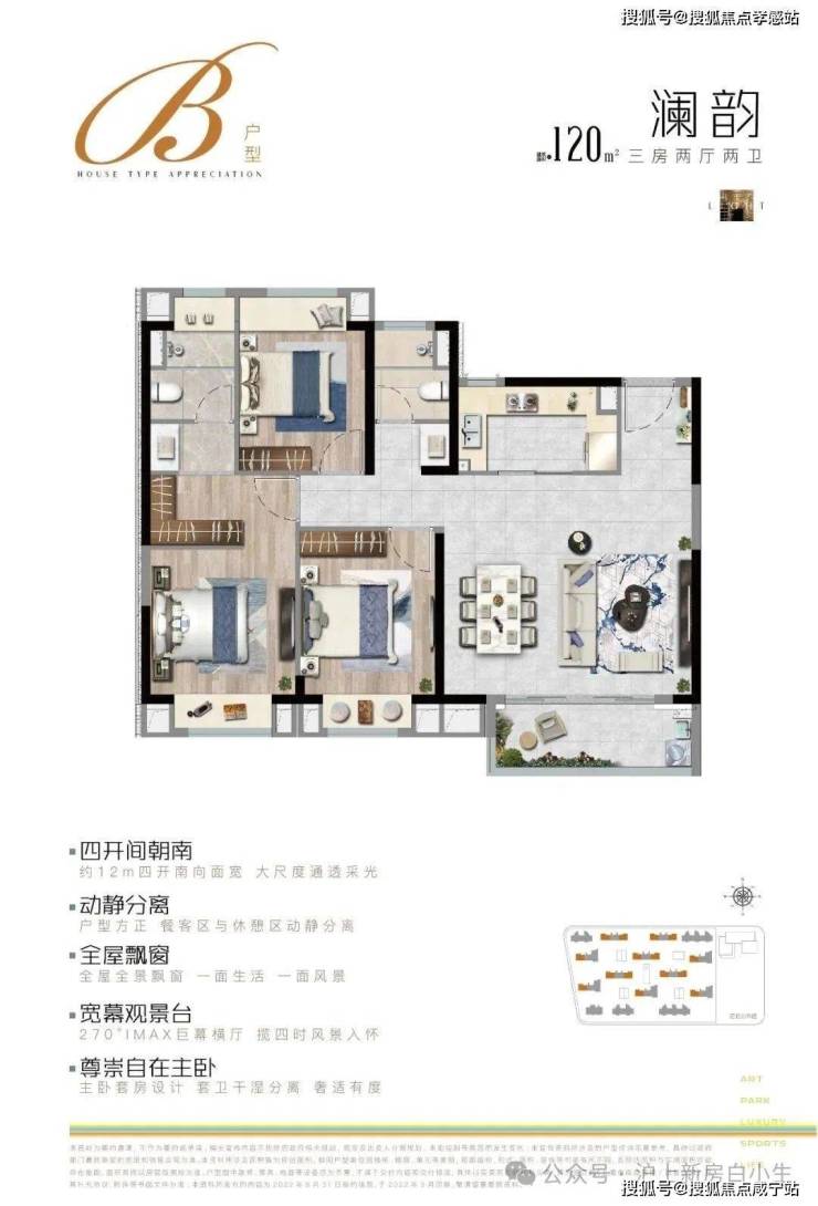 约120㎡3房2卫的户型,整体的尺度感相当惊艳。相比一般的紧凑型4房户型来说,这个户型的各个空间都非常宽奢,适合改善型家庭。