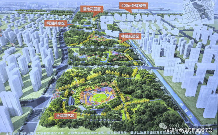 整座公园 (在建中 ) 划分为:湿地花园区、鸣湖共享区、林荫跃动区和社邻园艺区,四大功能分区。