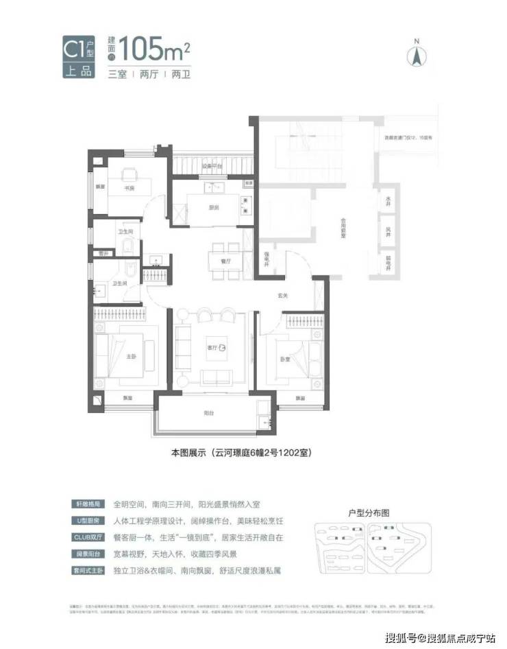 云河璟庭4#南向对望半岛公园,东边套可赏中庭景观;建面约129㎡四开间南向户型和建面约105㎡大面宽客厅户型,可同时观河景、揽园。