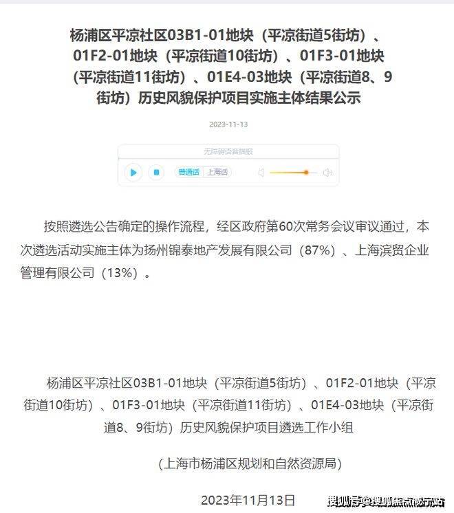 2023年12月,中信泰富(87%)联合杨浦国资(13%)通过协议出让,以总价1143905万元,楼面价63127元/m²竞得4宗打包地块: