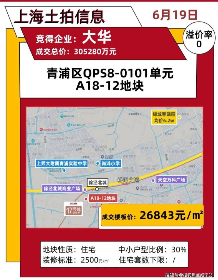 大华徐泾项目,成交总价305280万元,成交楼板价26843元/㎡,由大华集团底价拿下。地块出让面积4.94万方,容积率2.3,建筑面积约11.37万方,装修标准不低于2500元/㎡,中小套户型比例不低于30%。