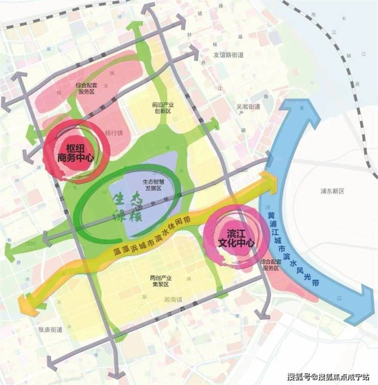 “五区”:杨行枢纽商务中心、滨水中心、宝武特钢地区转型的生产性服务业集聚区、宝武不锈钢转型的科技化创新区、蕰藻浜北岸预留生态智慧发展区则构成“五区”。