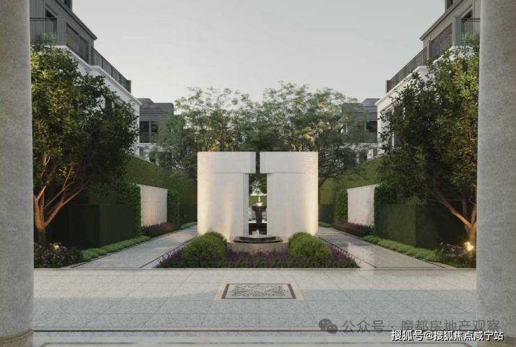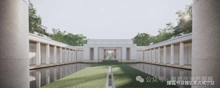 约378米的中轴对称归家轴,溯源梵蒂冈圣彼得广场的礼制设计,以“放-收-放”的空间节奏引导情绪过渡:进入社区前是开阔的市政道路(放),行至36米宽的南门门庭时,视线被水景与柱廊聚焦(收),穿过门庭后,中央花园的绿意与湖景豁然开朗(放),三步一景间完成从喧嚣到静谧的转换。
