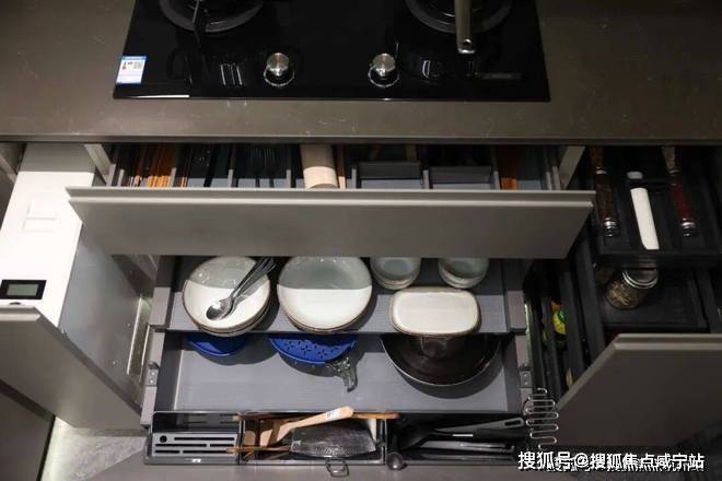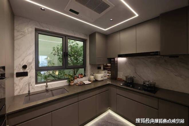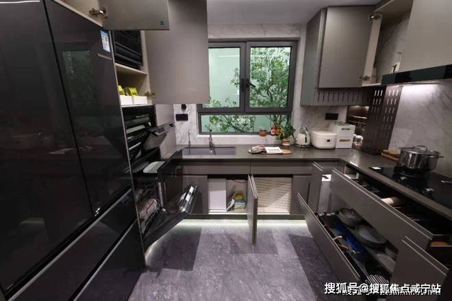 项目的厨房部分巧妙的利用了飘窗台做水槽的设计,一方面这提升了厨房实际使用空间,能将6件套家电塞下,同时保证橱柜配置满足功能。另外一方面这也让视觉空间上显得更大,更阔绰。