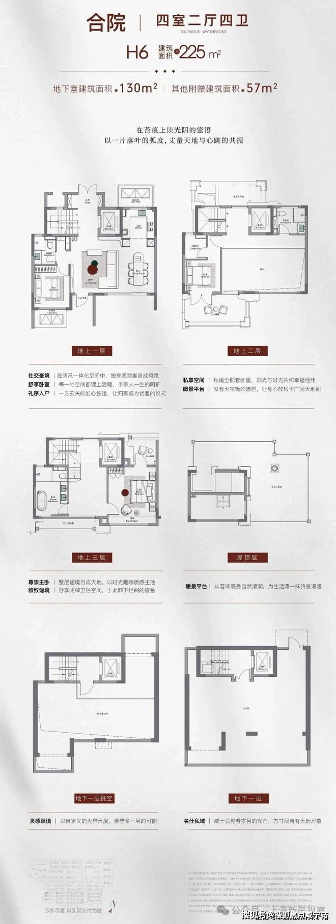 合院:建面约190㎡三室两厅三卫、约210-230㎡四室两厅三卫/四卫,附赠地下室+露台,总价预计约2000万;3层地上+地下室设计。