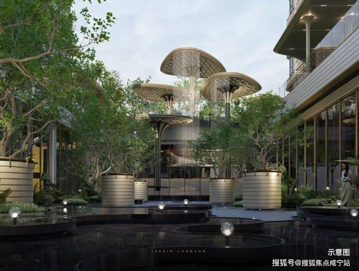 林岛漫步围绕中央景观,以现代艺术手法,打造森林岛屿景观循水归岸呼应外部天然水系,内部设置特色水景,串联不同节点闲庭雅致以树木、水系与局部连廊体系融合,共同组建起社区与居所之间的联通介质。