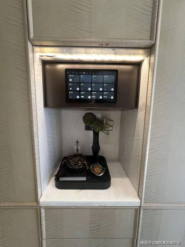 步入室内,右手边的玄关柜采用奢石台面,上附智能中控面板,配合氛围灯带营造归家仪式感。
