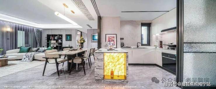 厨房所有墙面均采用大面积岩板,并且采用移门处理,水波纹玻璃不仅提升了质感,更减少了室内空间互相之间的阻隔感;