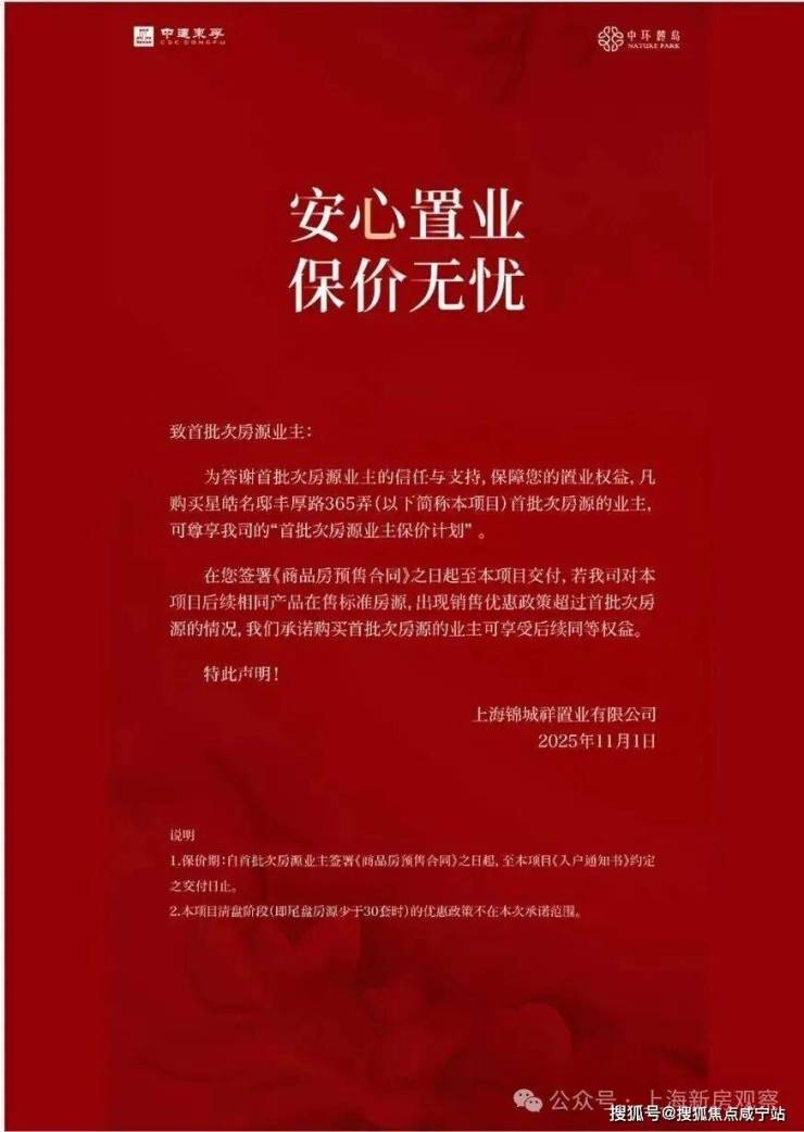 上海第二个作出“保价”承诺的项目,11月1日,中环麓岛项目也发布了公告:凡购买首批次房源的业主,可享“首批次房源业主保价计划”: