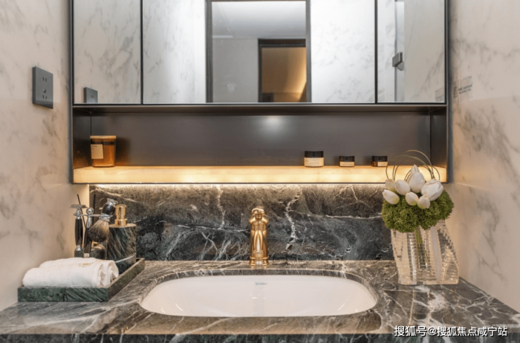 定制通高镜柜:在卫生间大面块的到顶镜柜,在镜柜背后还拥有一整套完整的隐藏洗漱收纳配置,整个卫生间的收纳空间丰富。镜柜底部还配有白雪公主奢玉具有低调的奢华之感,设有除雾镜,不仅考虑到了业主居家的实用性,同时也是改善品质与细节的体现。