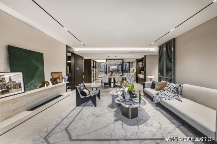 更在样板间内使用宝格丽奢石、水波纹奢境、流光纹奢板等,呈现出现代、美观、大气的海派奢适归心。