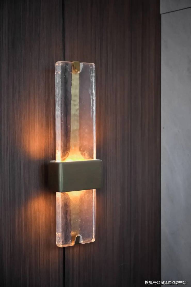 以 “提灯游园”为灵感,构筑仪式感归家动线!在公区入户大堂内,造型别致的壁灯,其灵感来自于 “中国古典豆形灯”;落壁灯则是 以古铜不锈钢搭配仿透光云石灯具,营造出朦胧的光晕氛围,颇具东方意蕴。