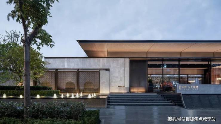 项目地上入户大堂在造型上运用了 中式元素挑檐,搭配香槟金型材金石嵌套设计,显示出一种奢而不张扬的感觉;同时,大堂 将国画中框景的手法运用其中,为归家创造一定的私密性和独特的东方礼序感。