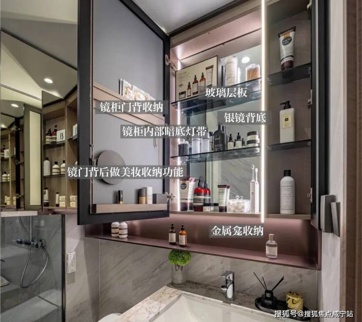 c.定制瑧悦专属女神卫生间,为每一个爱美的女性精心打造镜下收纳柜、金属收纳龛、侧面收纳龛等多个大进深收纳空间。