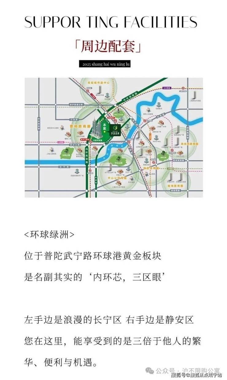 商业配套:环球港(48万方)约300m,凯悦大酒店约500m,龙之梦广场约1.9km长风大悦城约2.3km ,久光百货约3.3km(以上数据来源于高德地图,直线距离)。