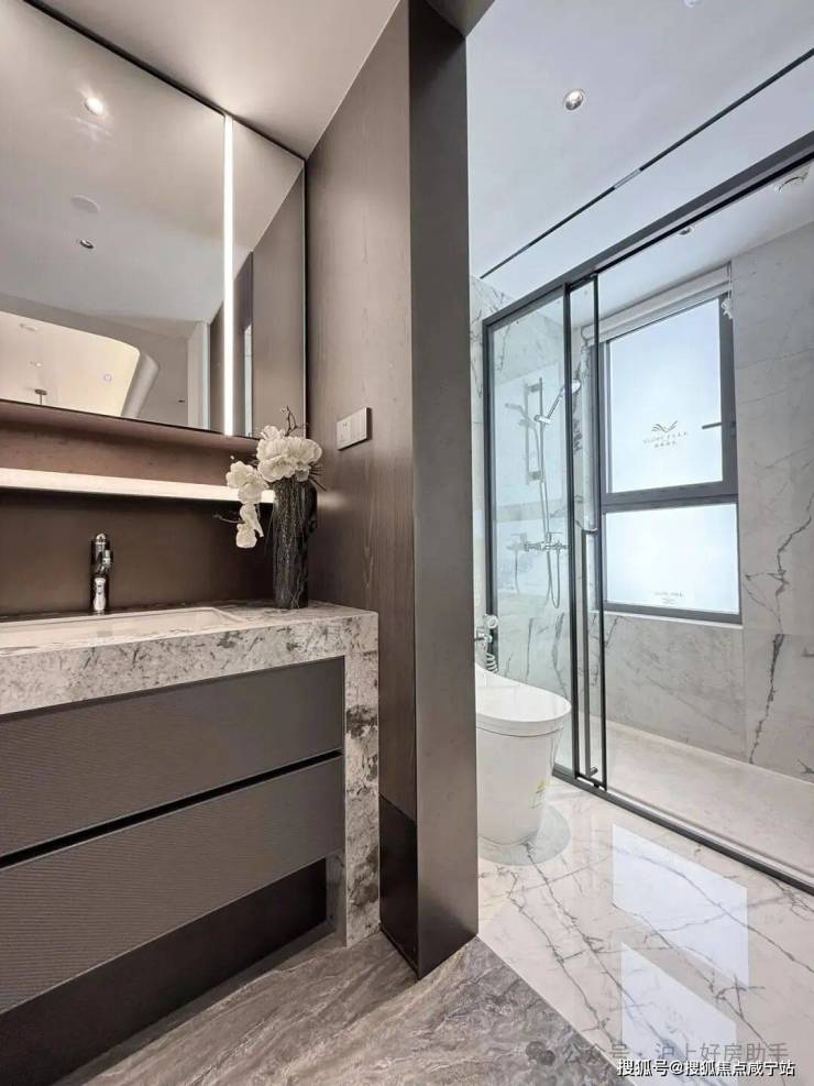 卫浴墙面采用寒江雪大瓷砖铺装,淋浴部分地面选用整块天然大理石。