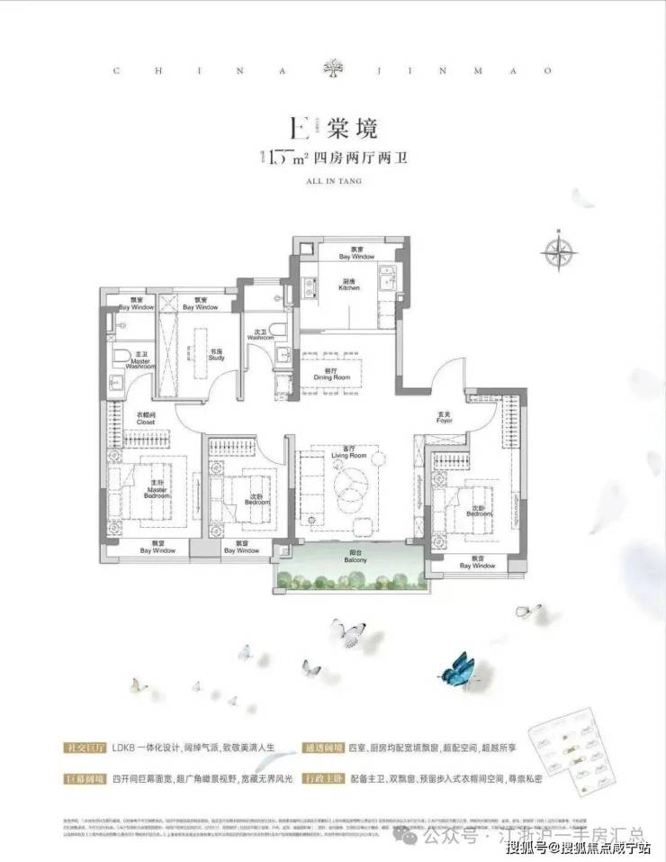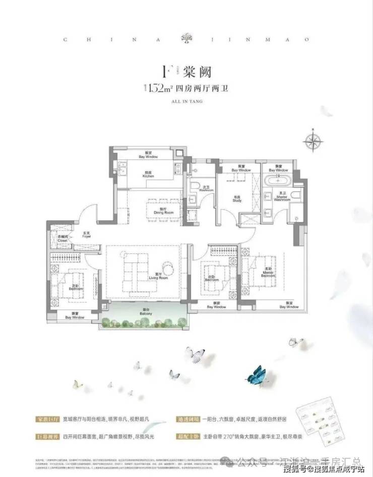 建面约117㎡3房2厅2卫,做到了3+1开间朝南+5个飘窗+主卧套房设计+270°转角飘窗,所有的尺度都有进一步提升。