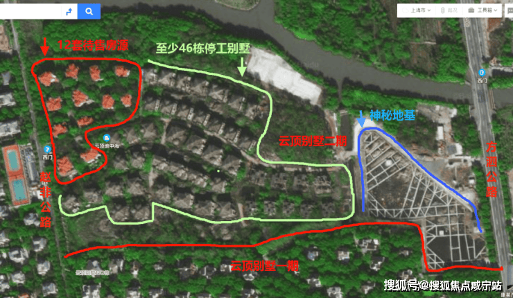 上海总是有这样的神奇神秘项目,不实地探访,根本发现不了这么多奥秘。这次待售的12套房源,只能算是云顶别墅二期西侧的一小块位置,更多的至少46套建造荒废的独栋别墅静默中,不知道开发商是否在后续会重启建造和陆续投入市场销售。二期东侧还有一片神秘地基。