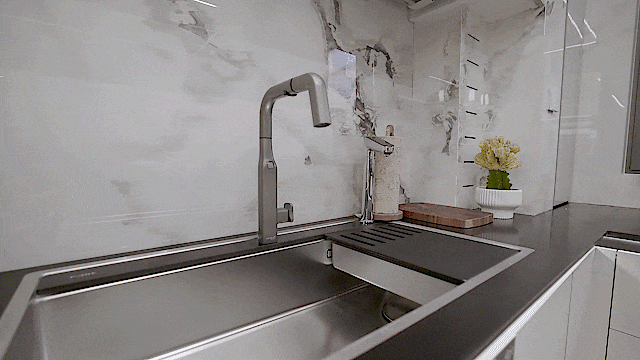 贝克巴斯零售款龙头,只需伸手感应就能出水;水槽下方的方太16件套洗碗机和方太净水器,既充分利用了下半部分空间,实用性又很高。