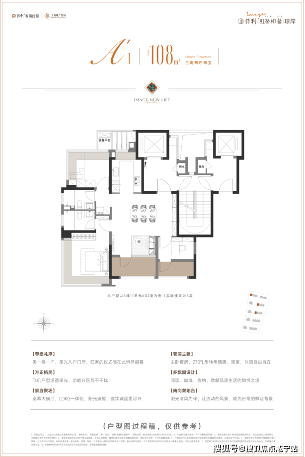 一梯一户、全明梯厅、双阳台、约 270°转角飘窗,几乎找不到短板,三口之家住得宽松,三代同堂也不会局促。