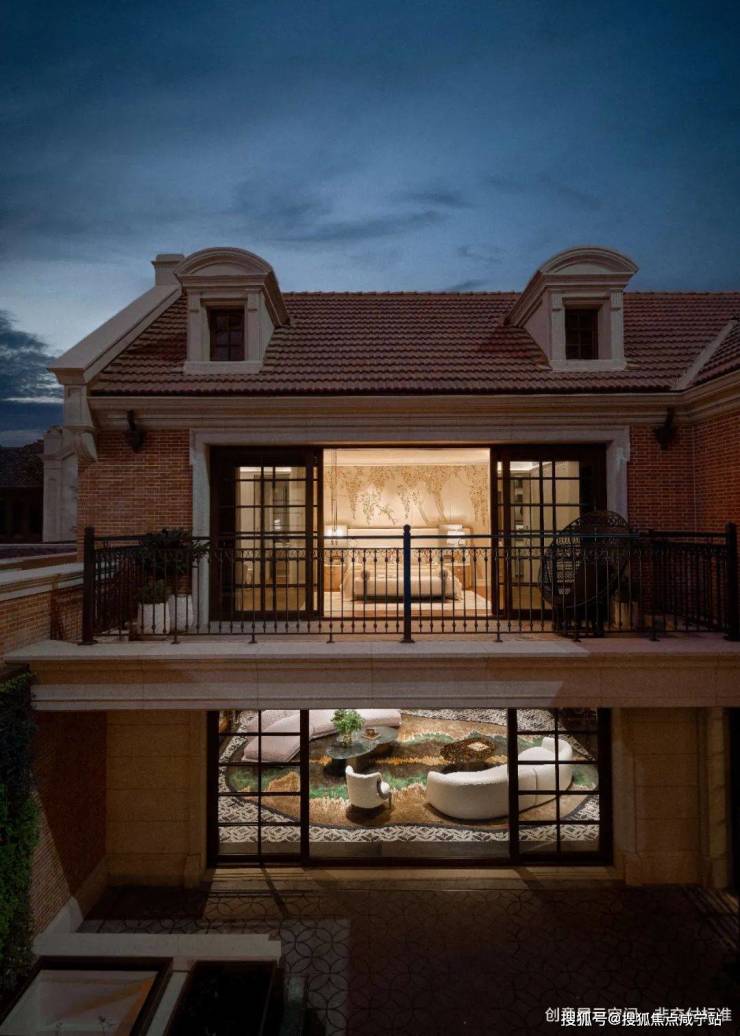 整个泳池天花板,呈现出海派拱形元素,落地玻璃窗外,是下沉式的景观空间: