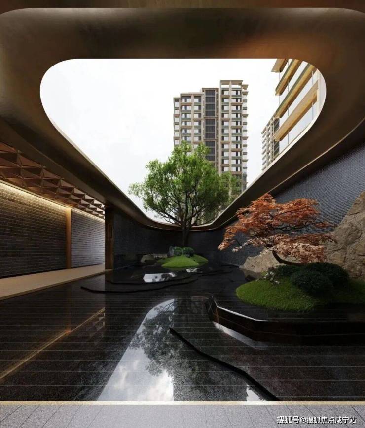 山水长卷的隐奢门庭:取意豫园中式园韵,打造约 99 米隐奢入口空间结合独立的车马院,风雨廊道与人车分流独立双入口,带来尊贵的归家体验。