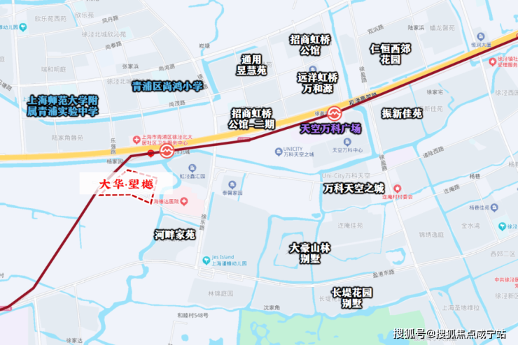 项目北侧紧邻17号线徐泾北城站(需绕行河道),1站可达徐盈路天空万科广场,2站至蟠龙古镇商业区,3站直达国家会展中心,4站即达虹桥枢纽。